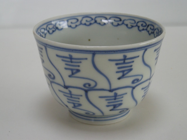 染付のそば猪口・向付けです。幕末~明治期の伊万里焼かと思われます。 寿の文字を図案化した模様で、見込みに太明年製の文字があります。 内側の縁どりは雲形模様が描かれています。 口径 8.5cm 高さ 6.5cm 重さ 130g 同様品数点あります。 ※中古品ですので多少のキズ、変色等ございますのでご了承ください。