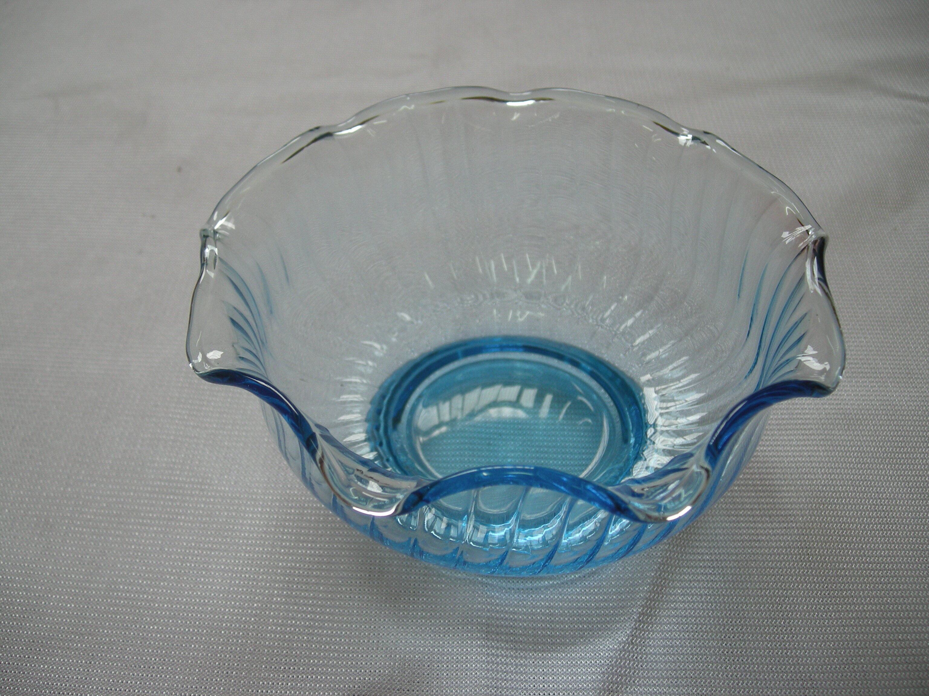 昭和レトロなガラス小鉢です。みず色で縁取りが波形。