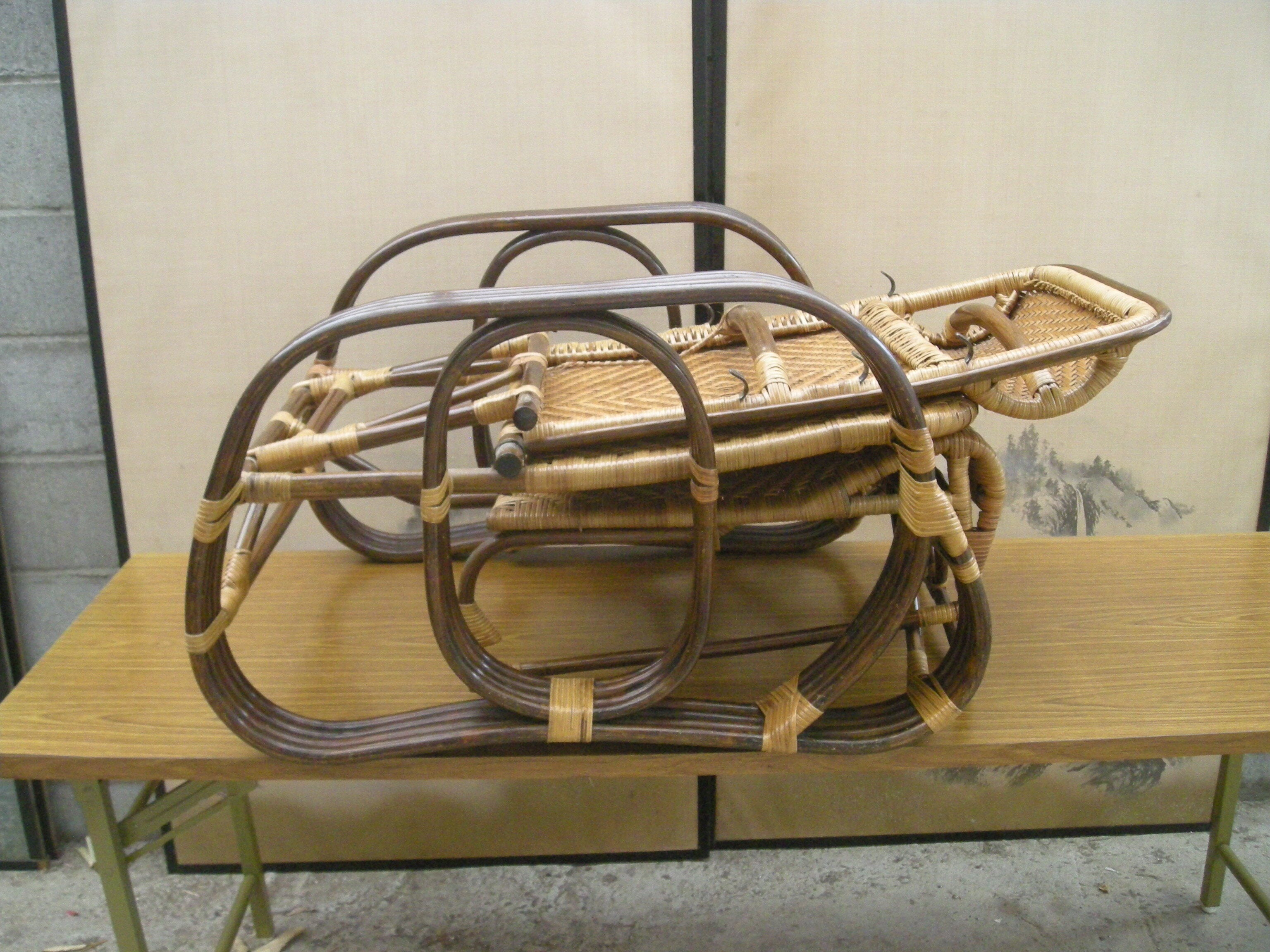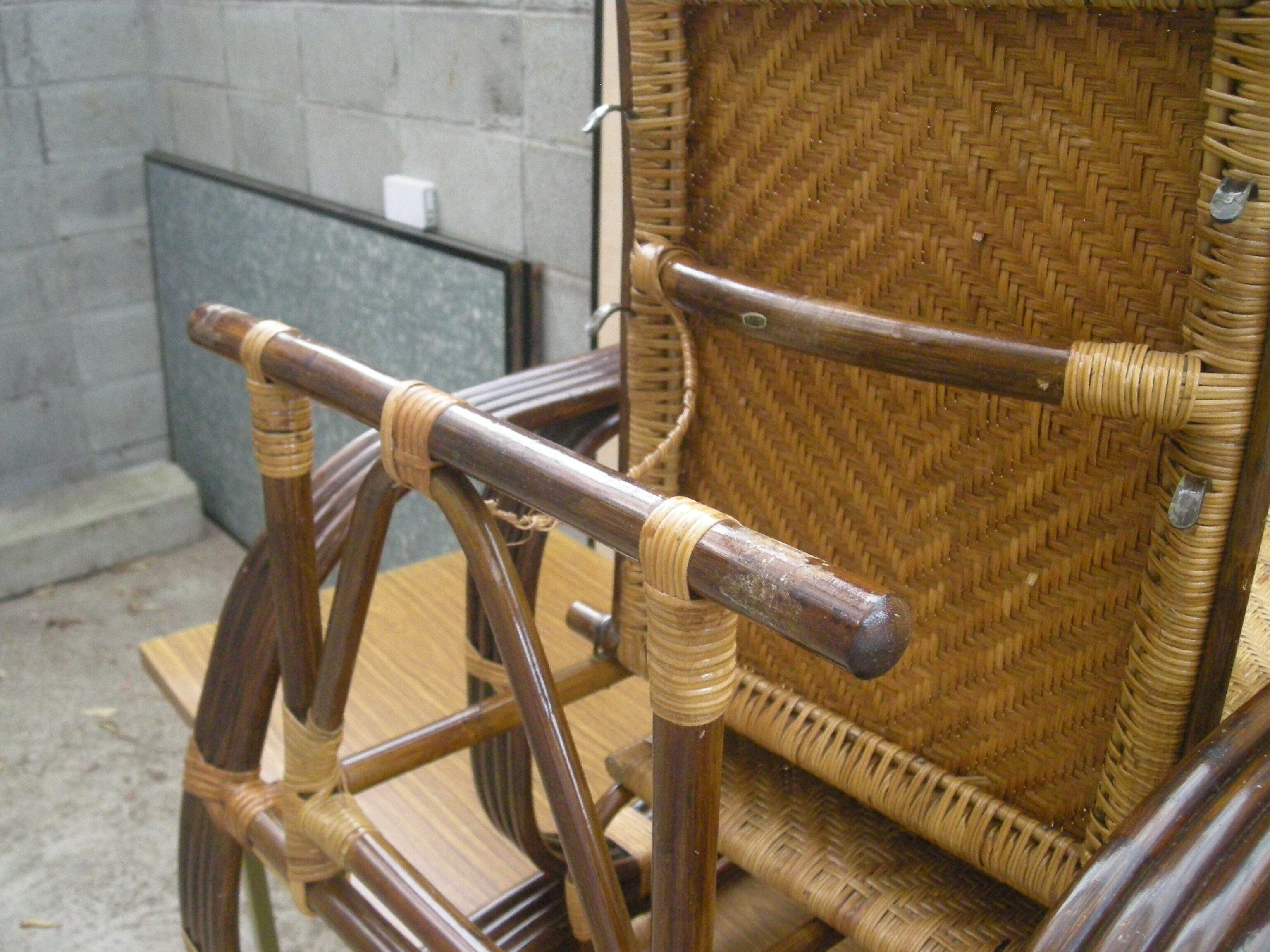 籐製の椅子です。背もたれが3段階調整でき、足元はオットマンが引き出せる様になっています。経年劣化での色褪せや傷がありますが、使用度は良いです。台湾製